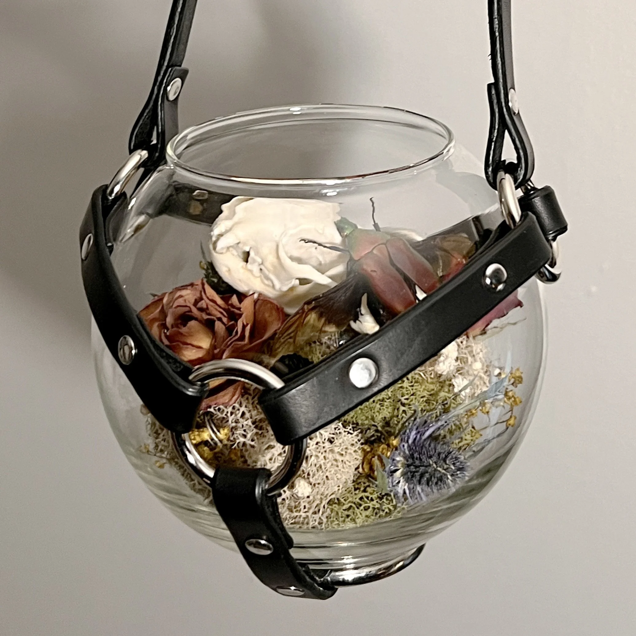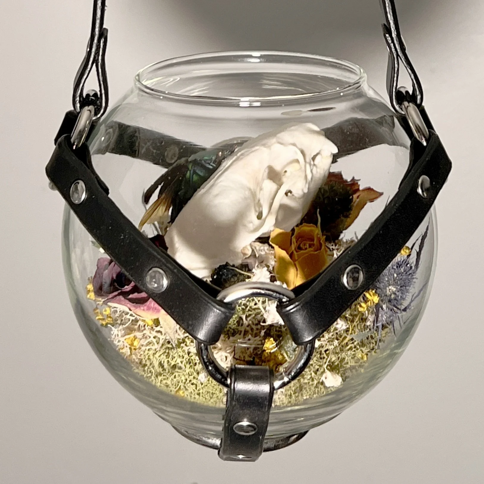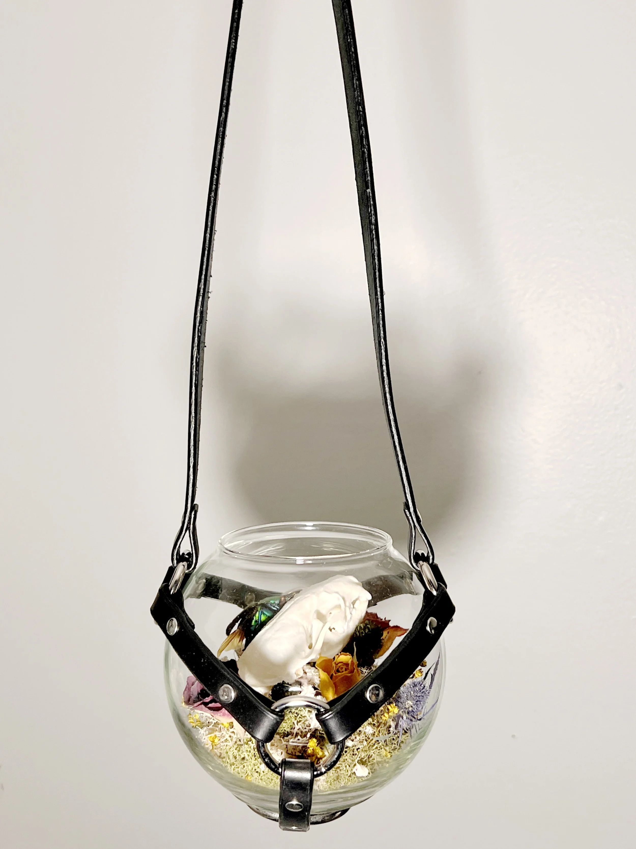 This is a 6” acrylic globe hanging from a spiked leather harness. choose from silver or gunmetal hardware. The leather harness hangs 20 inches long from a hinged o-ring that can clip onto a chain to hang exactly in the right spot.
