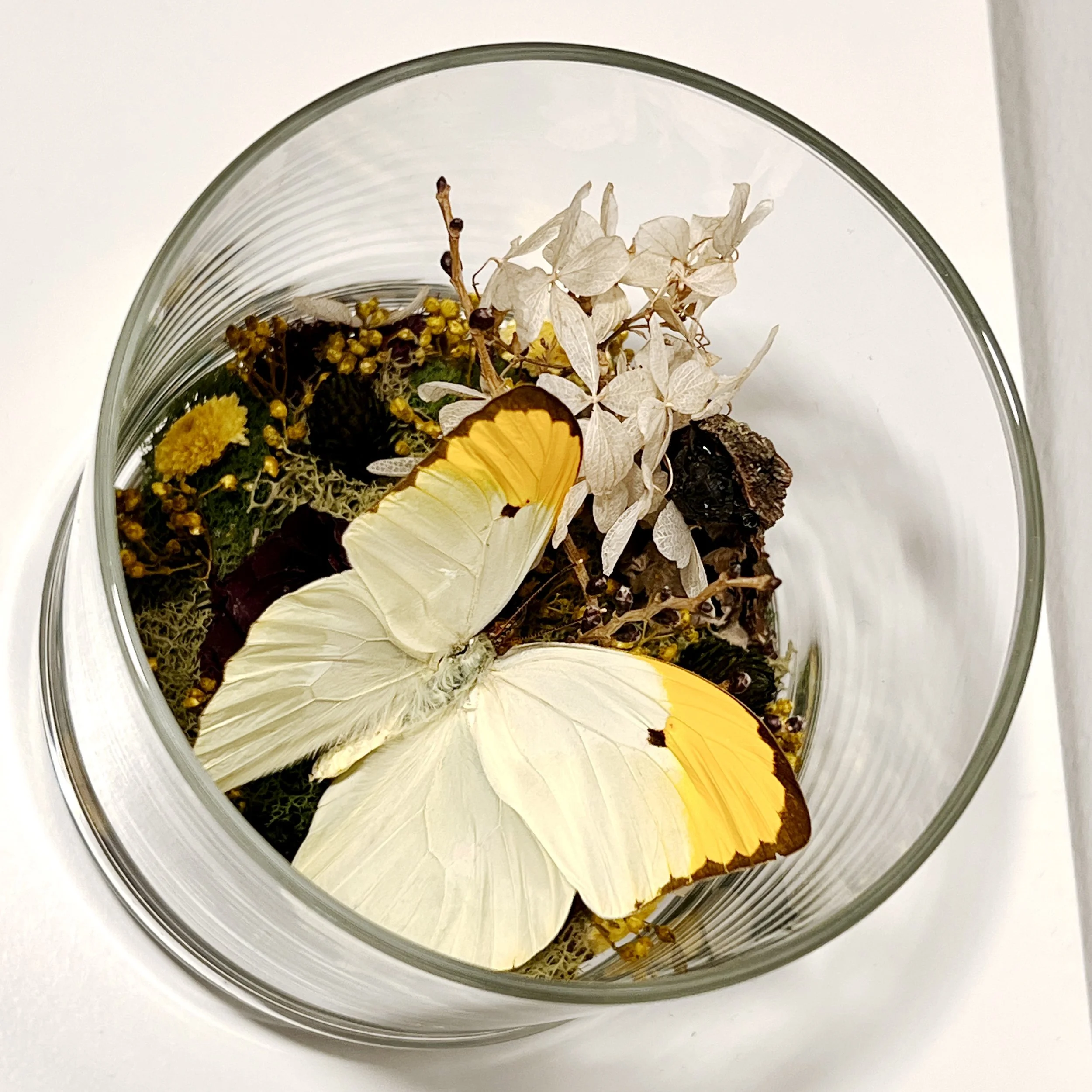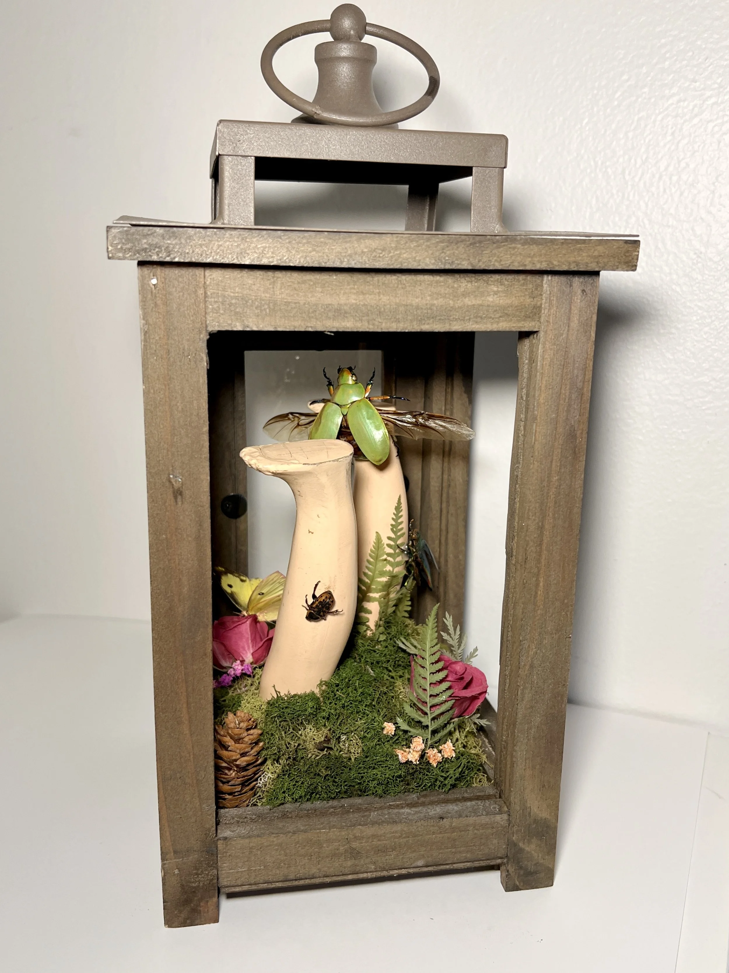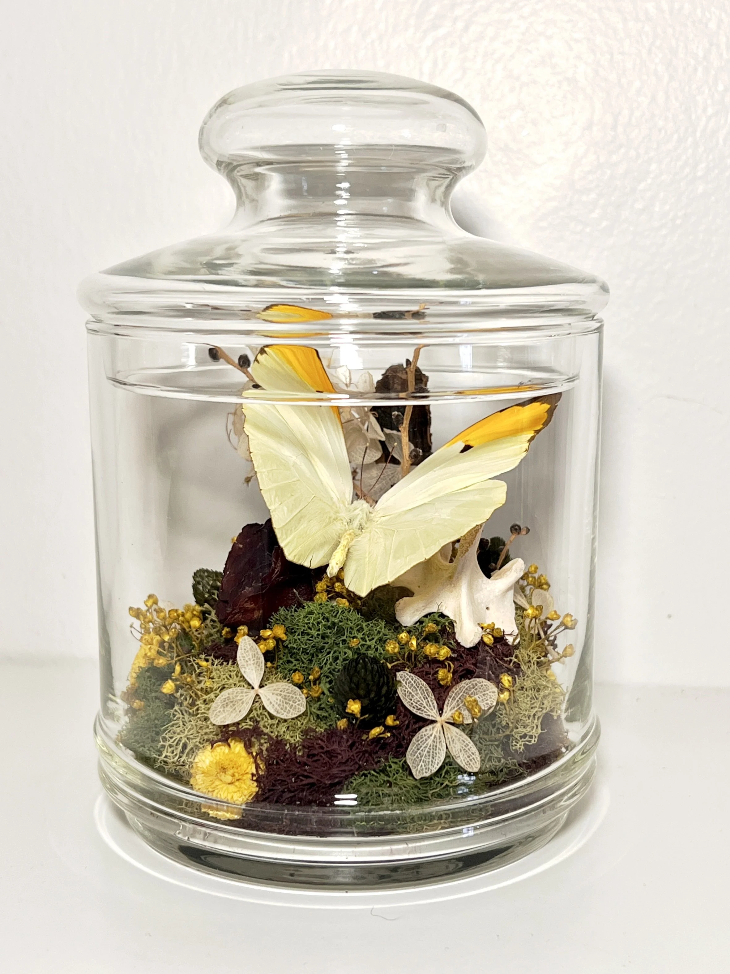 A muskrat skull decomposes on the forest floor, under a branch on which a two-toned Cicada (gaeana festiva) perches. A painted lady butterfly (vanessa cardui) lands on a thistle next to a chunk of amethyst in this dried terrarium.